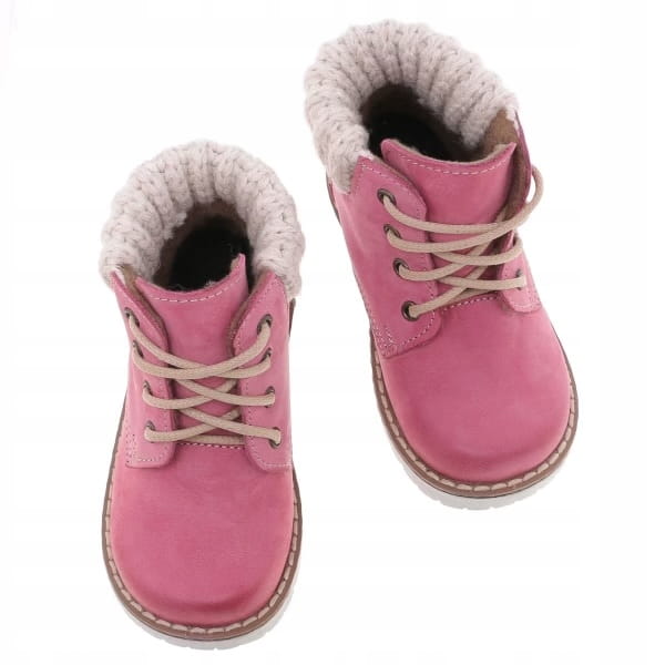 Buciki dziecięce wykonane ze skóry naturalnej w polskiej manufakturze w Częstochowie. Podszewka wełniana reguluje temperaturę i utrzymuje stopy w cieple. Buty mają usztywniany zapiętek i stabilną, antypoślizgową podeszwę.