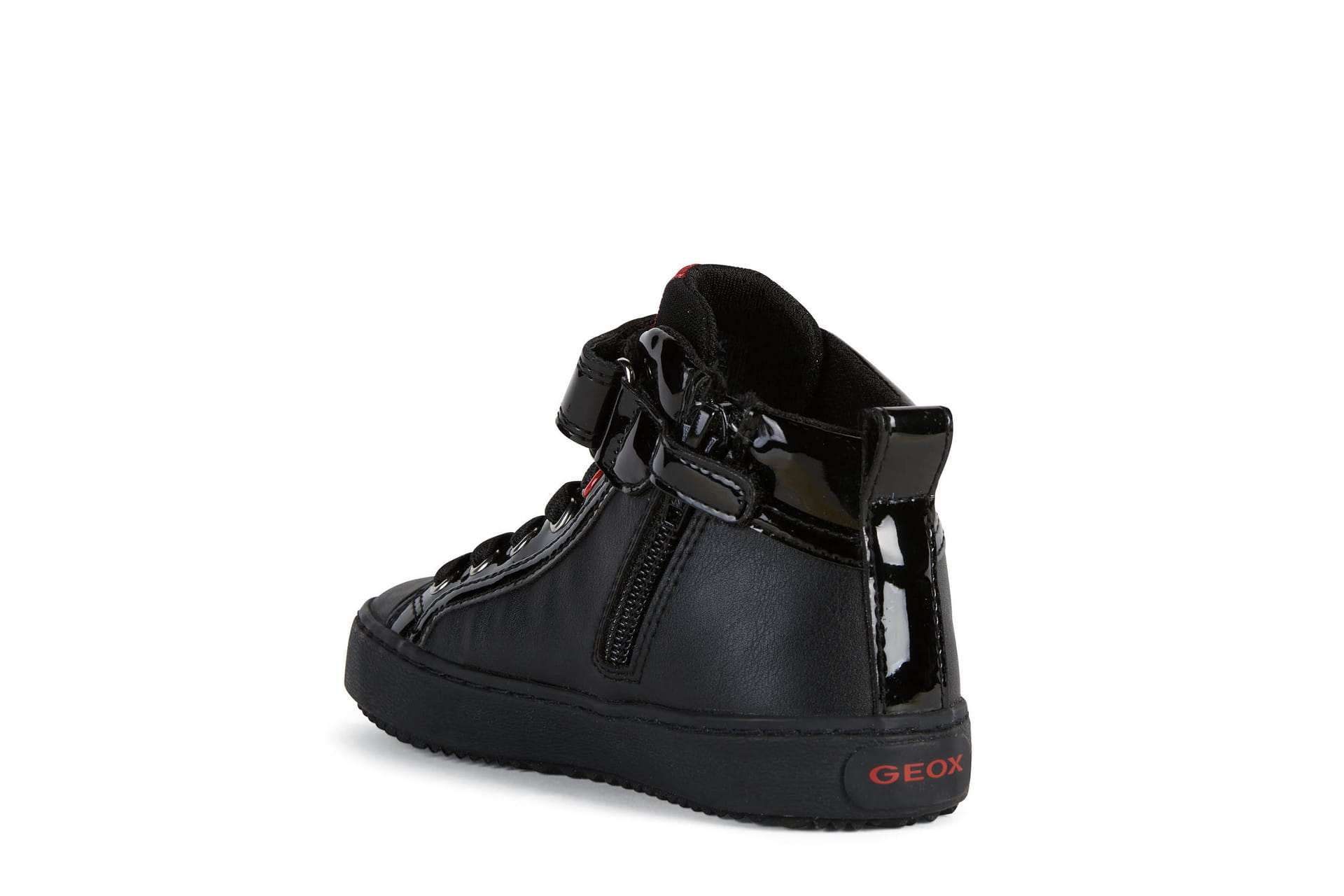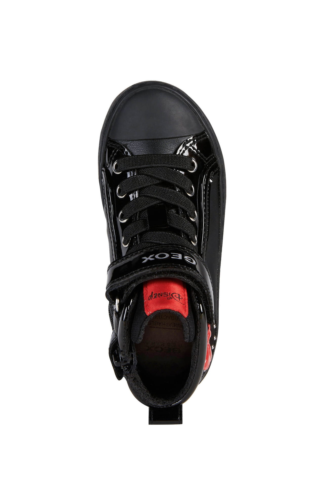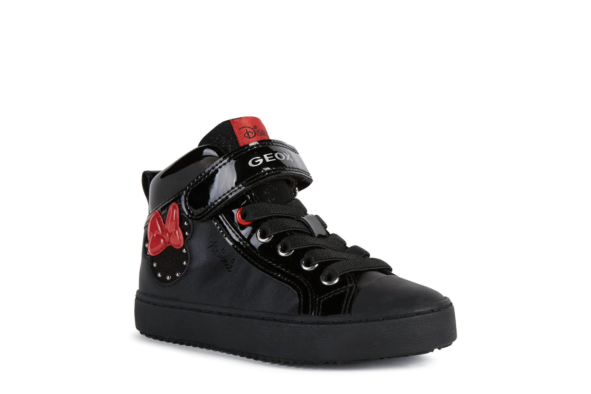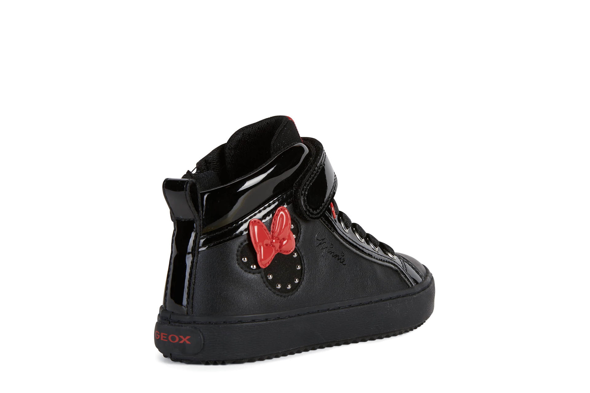 Dziewczęce sneakersy Geox to stylowe i wygodne obuwie stworzone z myślą o codziennym użytkowaniu. Model utrzymany jest w uniwersalnej czarnej kolorystyce, przełamanej czerwonymi detalami oraz ozdobą z motywem Minnie Mouse, która nadaje butom dziewczęcego i modnego charakteru. Cholewka została wykonana z wysokiej jakości materiałów syntetycznych o lekko połyskującym wykończeniu, które są trwałe, odporne na codzienne użytkowanie i łatwe w czyszczeniu. Praktyczne zapięcie na rzep w połączeniu z elastycznymi sznurowadłami ułatwia szybkie zakładanie i zdejmowanie butów oraz pozwala na dobre dopasowanie do stopy dziecka. Wnętrze obuwia zapewnia komfort noszenia przez cały dzień, a zastosowana technologia Geox Breathes z oddychającą, perforowaną podeszwą wspiera prawidłową wentylację stopy i ogranicza nadmierne pocenie. Stabilna, płaska podeszwa o dobrej przyczepności zwiększa bezpieczeństwo podczas chodzenia i zabawy.