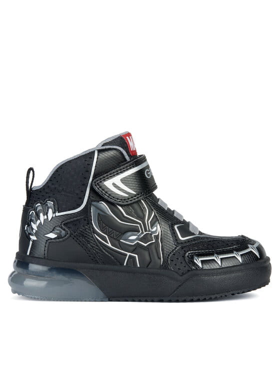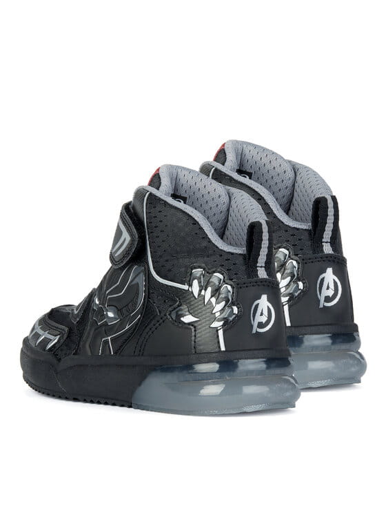 Dziecięce sneakersy GEOX Avengers to model stworzony we współpracy marki Geox z uniwersum Marvel, z motywem superbohatera Black Panther i nowoczesnym, efektownym designem w kolorze czarnym z srebrnymi detalami. Cholewka butów wykonana jest z połączenia materiałów syntetycznych oraz tekstyliów, co zapewnia lekkość, trwałość i komfort użytkowania, a perforowana podeszwa z technologią Respira gwarantuje doskonałą wentylację stóp i odprowadzanie wilgoci, co podnosi wygodę nawet podczas dłuższego noszenia.
