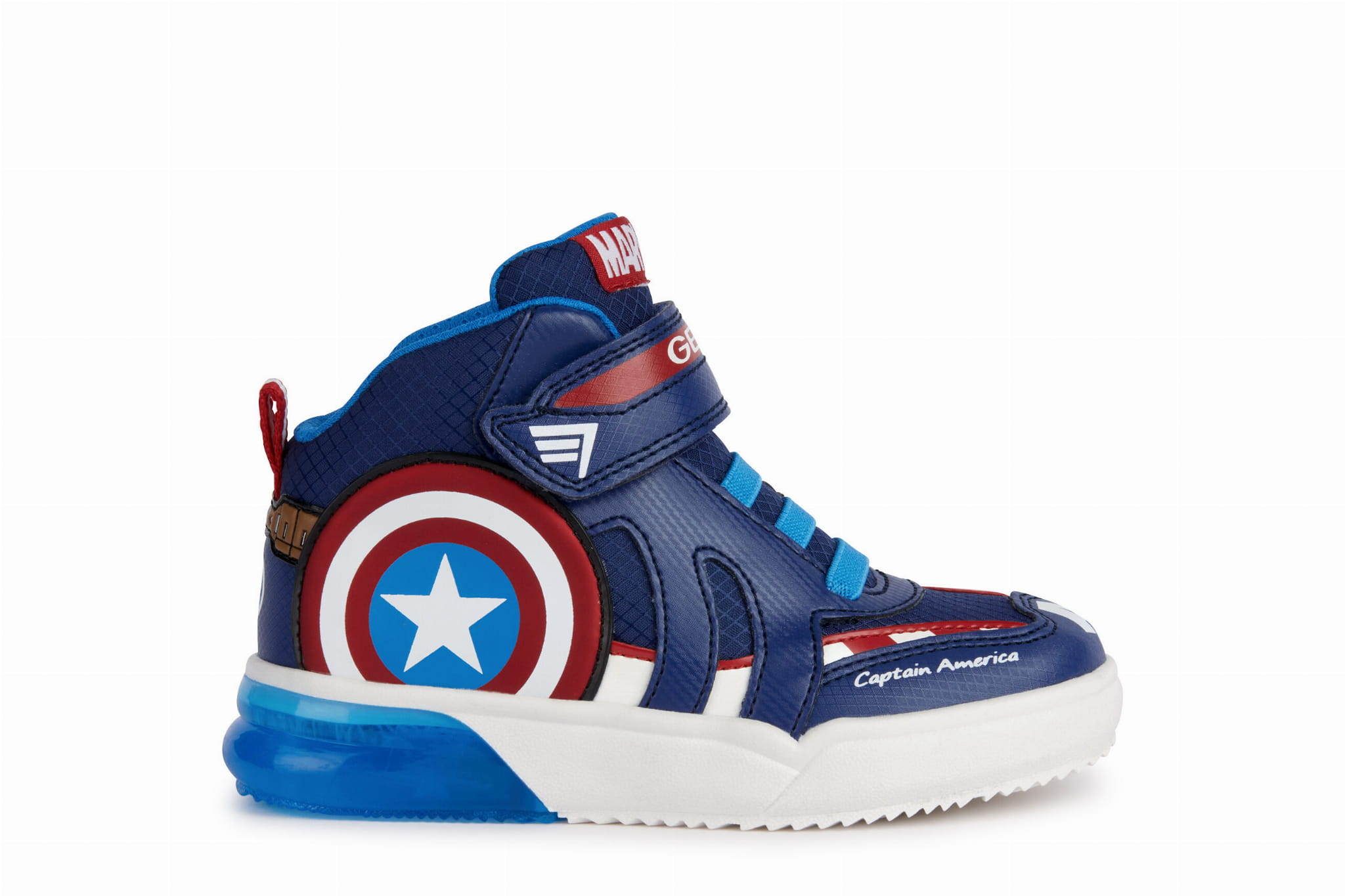 Dziecięce sneakersy GEOX Avengers to wyjątkowe buty stworzone we współpracy marki Geox z uniwersum Marvela, zaprojektowane z myślą o aktywnych dzieciach oraz młodych fanach Avengersów. Charakterystyczny wzór inspirowany postacią Kapitana Ameryki w kolorach granatowym i czerwonym nadaje im wyjątkowego charakteru, który z pewnością spodoba się każdemu chłopcu.