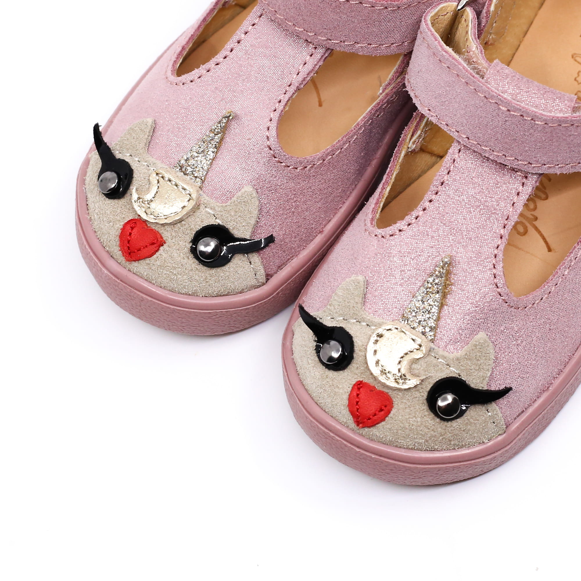 Balerinki zapinane na rzep umożliwiają szybkie i łatwe zakładanie, a usztywniona pięta oraz anatomicznie wyprofilowana wkładka skórzana wykonana z juchtu – ekologicznej skóry bydlęcej wyprawianej środkami roślinnymi – zapewniają optymalne wsparcie i wygodę. Te ręcznie wykonane buciki zachwycają pięknym kolorem oraz uroczym motywem jednorożców, który skradnie serca małych miłośniczek magii i bajek.